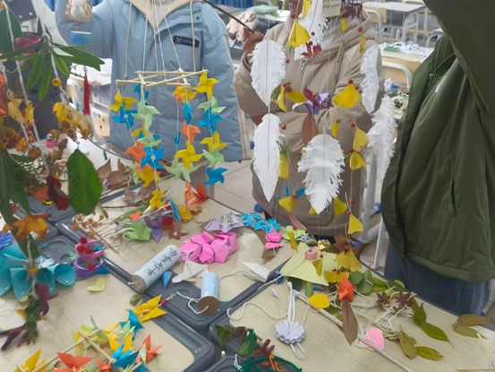 整个活动现场洋溢着温馨而热烈的氛围。在协会人员的精心组织策划下,同学们小心翼翼地穿线、打结,将一个个铃铛和装饰品巧妙地组合在一起。在制作过程中,同学们互相交流、沟通协作,充分发挥想想力,很快便讲各种落叶巧妙的串联起来。各种色彩斑斓的风铃充满了童趣,一些简约雅致的古风风铃,散发着浓郁的文化气息。