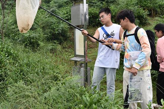 在普定县靛山村水稻基地,禇代洋村支书介绍了当地特色稻田农业生产方式——稻田养蛙和释放赤眼蜂防治害虫,通过生物防治与现代科技相结合,打造高效优质农产品。同学们在老师的带领下捕捉昆虫和观察作物病害,了解到的水稻主要虫害有:螟虫、稻飞虱和稻纵卷叶螟等。常见的病害:稻瘟病、白叶枯病、黑条矮缩病、纹枯病和细菌性条斑病等。
