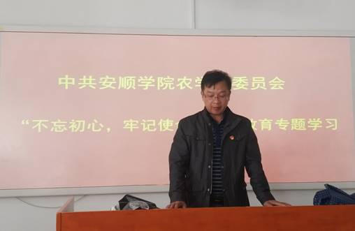 会上,汪希敏同志领学了习近平总书记在中共中央政治局第十五次集体学习时的重要讲话精神,翟精武同志领学了习近平总书记在中央和国家机关党的建设工作会议上的重要讲话精神,周中艳同志领学了习近平总书记在内蒙古考察并指导主题教育时的重要讲话精神,孙月华同志领学习近平总书记在中央党校(国家行政学院)中青年干部培训班开班式上的重要讲话精神,喻辉同志传达了中共安顺学院农学院委员会《关于切实做好“不忘初心、牢记使命”主题教育工作的通知》和工作安排,并对主题学习提出了相关要求。