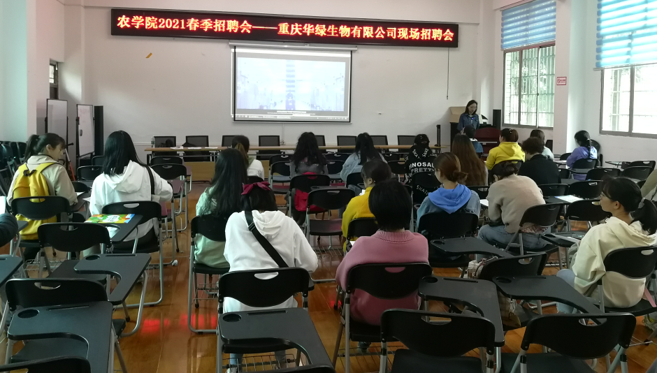 2021年3月16日上午,我院携手重庆华绿生物有限公司在电教楼1楼招聘大厅举办“重庆华绿生物有限公司2021春季专场招聘会”。本次招聘会是我院联合学校招就处举办的第二场春季专场招聘会,主要为应届毕业生提供就业岗位。