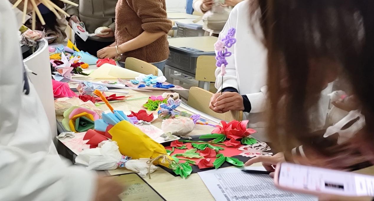 活动现场,繁花似锦,芬芳四溢。学生们纷纷拿出自己闲置的物品,有饱含墨香的书籍、精美的手工艺品、秀色可餐的美食等,用以换取一束束娇艳的手工花。这些物品承载着同学们的故事与情感,在交换中传递出独特的价值,绽放青春温暖与美好。