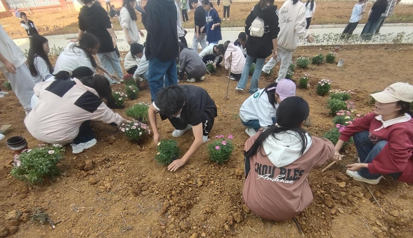 活动前,同学们精心筹备策划,提前准备了花卉种子和菊花盆栽,种植所需锄头、水管、水桶、铲子等劳动工具。活动现场大家热情高涨、干劲十足,全体成员分工明确,翻土、挖坑、放入植株、盖土、浇水,每一个步骤都认真完成,仿佛在呵护一个个新生的生命。