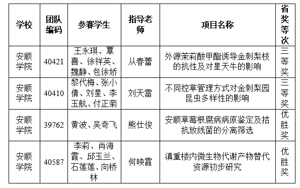 11月27日至11月28日,由贵州省大学生生命科学大赛指导委员会主办、六盘水师范学院承办的第四全国届大学生生命竞赛(贵州赛区)暨第二届贵州省大学生生命竞赛落下帷幕,安顺学院副校长张来、农学院副院长张玉波带队参加比赛,我院有2支参赛团队进入现场答辩环节并获三等奖,另2支参赛团队通过专家网评获大赛优胜奖。